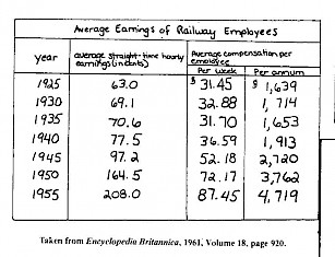 The operating group of employees who worked for the railroad was divided into two parts: yard employees and those on trains. Yard employees, about 40% of the operating group, were paid on an hourly or daily basis. Eight hours was a day’s work and overtime was paid for at the rate of 150% of the basic rate. (See chart.)