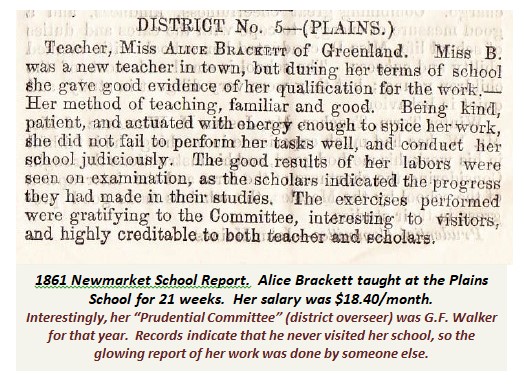 Along with Sarah and George Walker, another boarder at the Creighton’s farm was a daughter of James’ cousin, Alice Brackett (1836-1905). Alice was a schoolteacher in town, and during the period of James’ wife Charlotte’s bereavement and her absences to visit relatives in Rhode Island, Alice would take over as housekeeper for James, and caretaker for the recluse Martha Drew in the upstairs room.