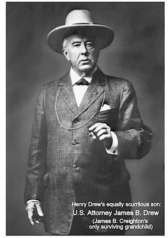 Henry died in February 1876. Two months earlier James B. Creighton had made a codicil to his will acknowledging his runaway son-in-law: “I also give and bequeath unto Henry Drew who was formerly the husband of my daughter March M. Drew the sum of one dollar.”