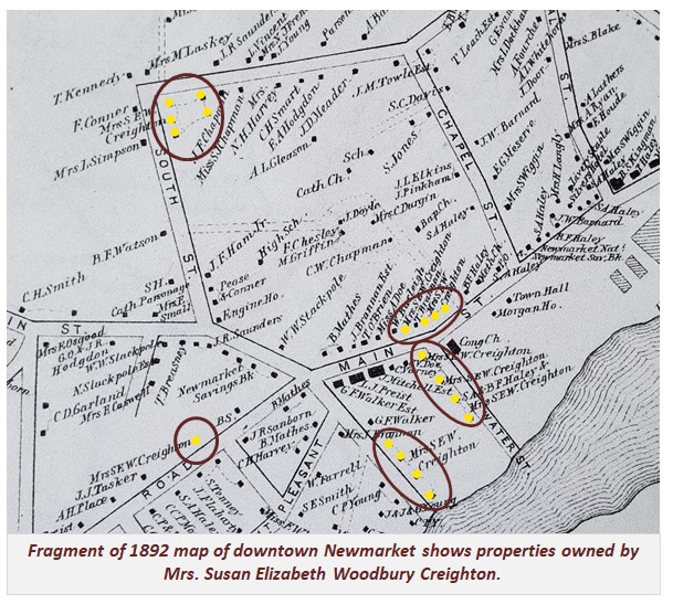 The store was rebuilt; later she bought out the mortgage, and Woodridge W. Durell moved his dry goods business into the building. For over 100 years it was known locally as the “Wooden Creighton Block”. When she died in 1899, Susan left that building as well as her residence on Tasker Lane to the Newmarket Congregational Church.
