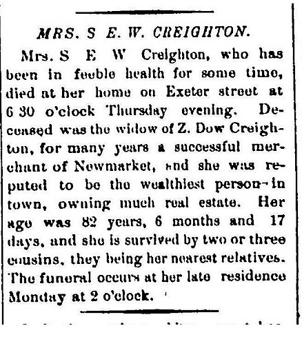 and estate in the Newmarket homestead formerly occupied by Z. Dow Creighton.