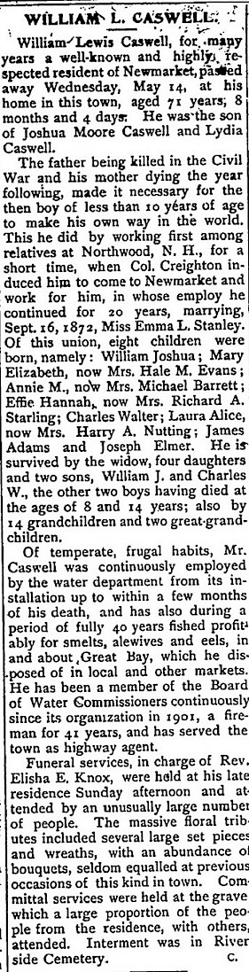 As detailed in his obituary, when he was ten years old, Mr. Creighton approached him and brought him to Newmarket where he worked for him for 20 years. William lived with the Creighton family until sometime after 1872 when he married. He was a farm laborer, a carpenter, a sailor and a fisherman. Later he was the first employee of the Newmarket Water and Sewer Department and remained with the Departrment until his death in 1924. In many printed April newpaper accounts, William was usually the first man to take his motorboat out on the Lamprey River once the ice left.