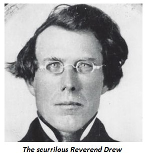 Rev. Henry Drew was the minister of the Methodist Church in Rye, NH in 1843, followed by two years in Rochester, NH. In 1849 he established a Methodist congregation in Salmon Falls, NH where he held the prayer meetings for his 24 parishioners in the Town Hall. Then, in 1851 he left the area and headed west, abandoning his wife and son.
