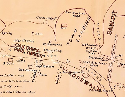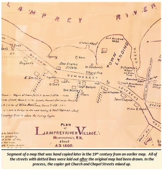 The 1800 Lamprey River Village map segment shows not only the SHIP BUILDING YARD (part of the TOWN LANDING), but also wharfs, shops and barns owned by known shipbuilders, and there is evidence that the other side of the “creek”(AKA Moonlight Brook) was used for shipbuilding as well.