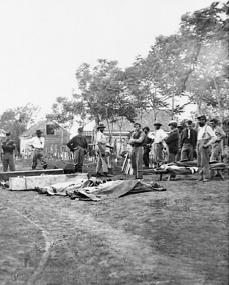 Regimental hospitals much closer to battlefields, on the other hand, could not offer the kind of attention that larger hospitals provided the dead. Descriptions of death and dying in these locations can be found in a number of soldiers’ letters and diaries. The presence of corpses, as well as other reminders of human mortality like piles of amputated limbs, did not evoke images of order and solemnity. Instead, death and burial had many of the same characteristics as found on fields of battle, though a rudimentary graveyard next to these hospitals allowed for a slightly more organized space for disposing of remains.