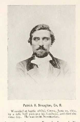 Patrick Henaghan – enlisted from Newmarket on 28 May 1861 at age 28 as a Private in Company B, 2nd Infantry, and he mustered in in 1 Jun 1861. Killed in Action at Battle of Oak Grove, VA 25 Jun 1862 .