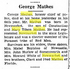 E. George Maynard Mathes (1882-1932), When Constantine died, his youngest son was 14 years old. Four years later, in the 1900 census he was living with his mother and siblings, with no listed occupation. In 1904 when John D. Long resigned from the Police force, George covered his beat, and he remained on the Newmarket Police Department from 1904 until 1926. In 1920 he was chosen as Newmarket’s Police Chief, a position he held until he retired in 1926.