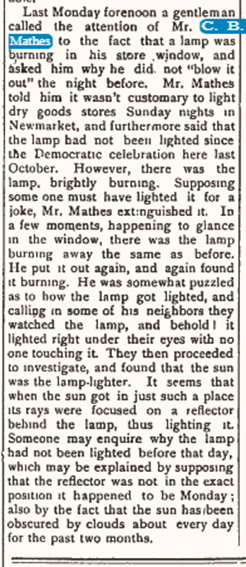 He was in friendly competition with his brother, Constantine’s adjacent dry goods store – in seeing who could display the more outrageous item in their store windows. In the fall of 1885 Benjamin won when he displayed a 16.5 pound purple turnip grown by his brother-in-law Daniel Dow of Epping.
