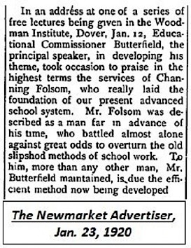 After 16 years in Dover—during a time of many changes in both policies and methods—the N.H. Board of Education hired Mr. Folsom as Superintendent of Public Instruction. He set to work to raise the educational standards of the state, first working to arouse the support of the public. He realized that many communities could not support the kind of school they wanted because of limited resources. (No doubt his first teaching experience in Newmarket bore that out!)