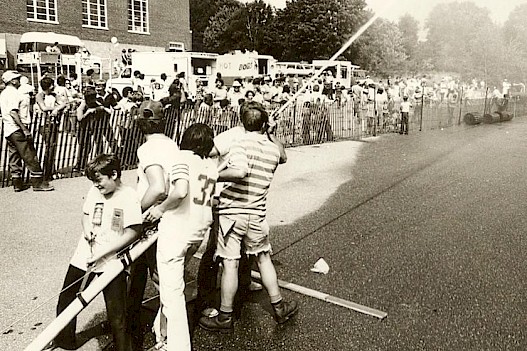 Down the center of the parking lot was a fenced-in area with a strip of paper lying down the center of the area. Along the sides were flags posted along the fence. A distance from this enclosure, a platform or “dock” was erected; close by was a large barrel with a hose leading to a nearby fire hydrant.