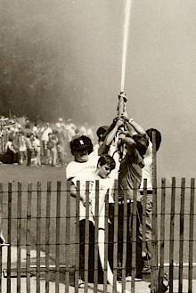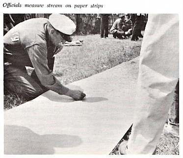 A foreman sits astride the top of the tub with kerchief over held over his head. The crew relies on this foreman (in 1977 it was Larry Pickering) who watches the flags down the field for the sign of a breeze. The crew on the pumping bars wait as do the men holding and aiming the hose down that strip of paper. The signal comes, muscles tense and the pumping begins – it lasts at the most two or three minutes of an intense workout.
